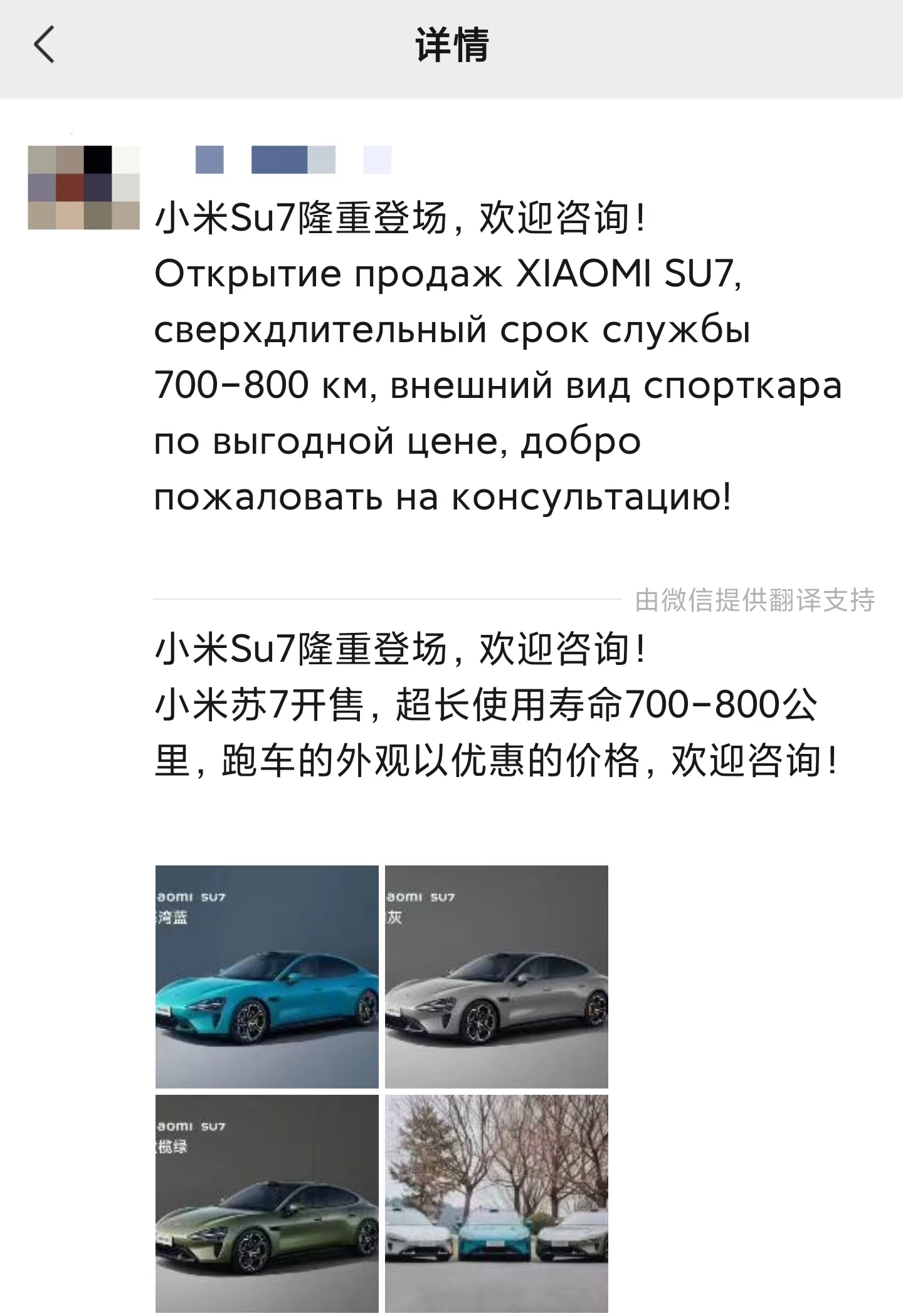 在小米汽車3月28日上市發(fā)布會(huì)后,吳經(jīng)理第一時(shí)間在朋友圈用兩種語言發(fā)布了小米汽車的廣告。3月29日,吳經(jīng)理向時(shí)代財(cái)經(jīng)透露,已經(jīng)有兩位俄羅斯客戶表示感興趣:“他們的評(píng)價(jià)是車很漂亮,算上運(yùn)到中國口岸的成本價(jià)格也合適。打算觀望一下再下單。”egt驛資訊