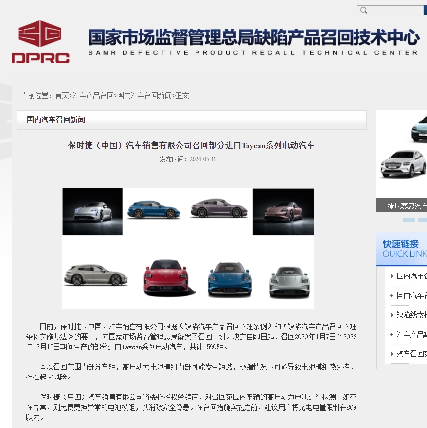 5月11日,保時捷(中國)汽車銷售有限公司根據(jù)監(jiān)管要求,向國家市場監(jiān)督管理總局備案了召回計劃,決定自即日起,召回2020年1月7日至2023年12月15日期間生產的部分進口Taycan系列電動汽車,共計1590輛。召回公告指出,本次召回范圍內部分車輛,高壓動力電池模組內部可能發(fā)生短路,極端情況下可能導致電池模組熱失控,存在起火風險。loO驛資訊