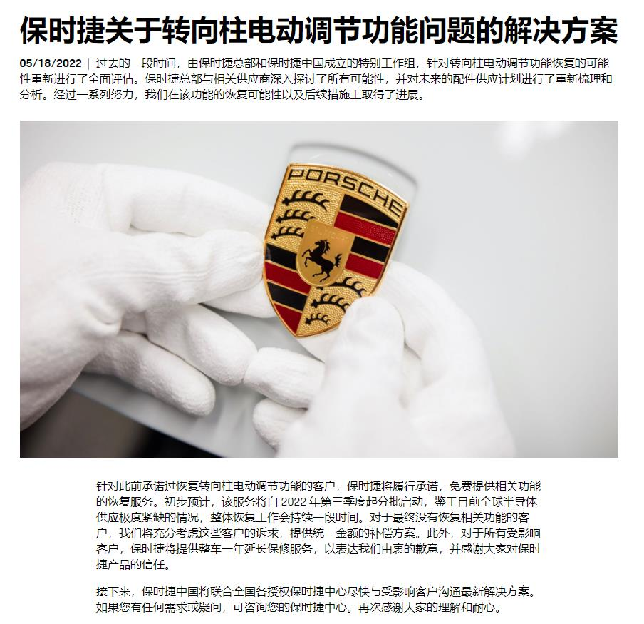2022年5月18日,保時捷公布關于轉向柱電動調節(jié)功能問題的解決方案,“針對此前承諾過恢復轉向柱電動調節(jié)功能的客戶,保時捷將履行承諾,免費提供相關功能的恢復服務”“對于所有受影響客戶,保時捷將提供整車一年延長保修服務”。