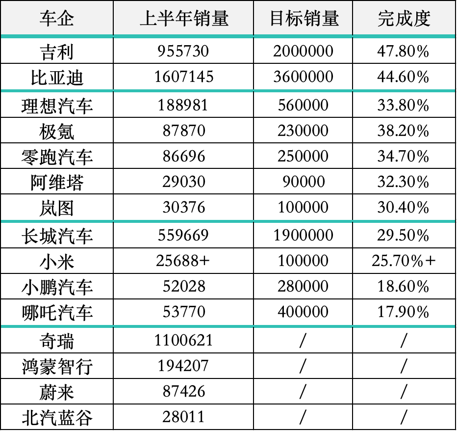 吉利同期銷售95.6萬輛汽車,達(dá)到其原定190萬輛全年目標(biāo)的50.3%。吉利控股方面在7月1日宣布,將全年目標(biāo)上調(diào)至200萬輛,以此計(jì)算完成度為47.8%,依舊位居國內(nèi)車企首位(僅統(tǒng)計(jì)已公布上半年數(shù)據(jù)的車企,下同)。