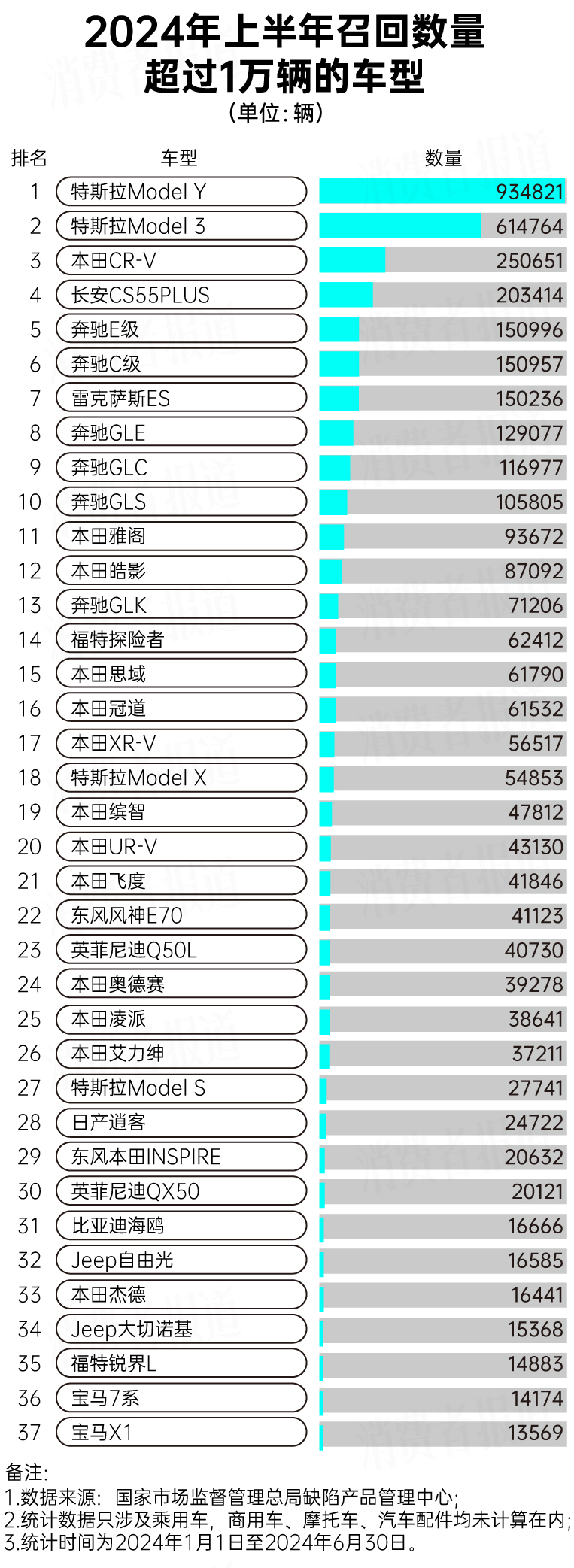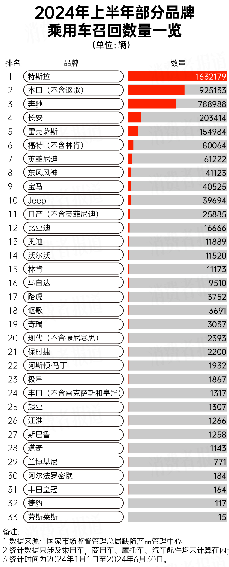 2024年上半年,特斯拉召回?cái)?shù)量最多,召回超過163.2萬輛汽車。排在其后的本田(不含謳歌)召回超過92.5萬輛汽車,而奔馳也召回近78.9萬輛汽車。自主品牌中,長安召回?cái)?shù)量最多,召回超過20.3萬輛。26K驛資訊