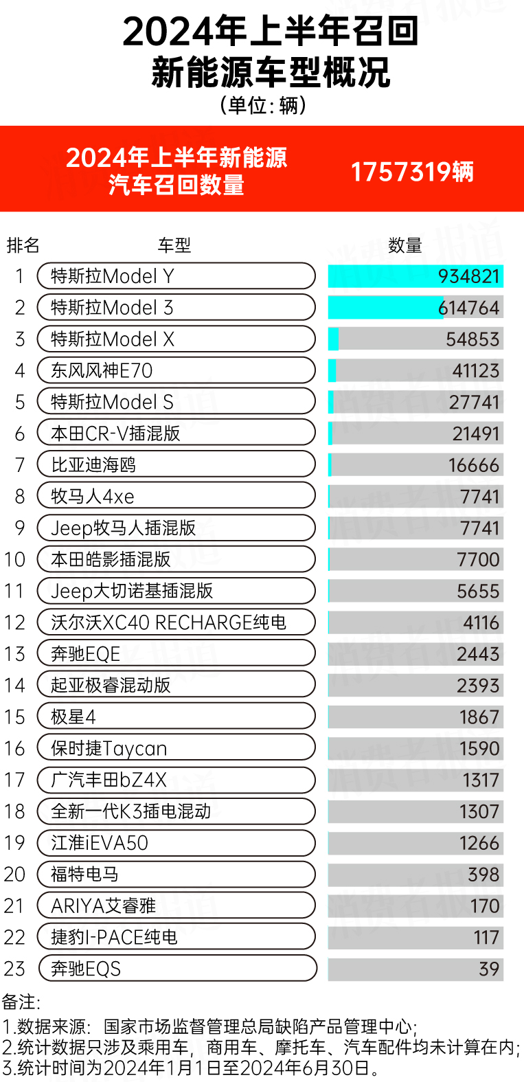 今年上半年,共有超過175.7萬輛新能源汽車被召回,占比超過43%。其中,召回?cái)?shù)量前五名的新能源車型中,特斯拉的車型占據(jù)四席。此外,比亞迪海鷗有超過1.6萬輛汽車被召回,本田CR-V插混版召回超過2.1萬輛。26K驛資訊