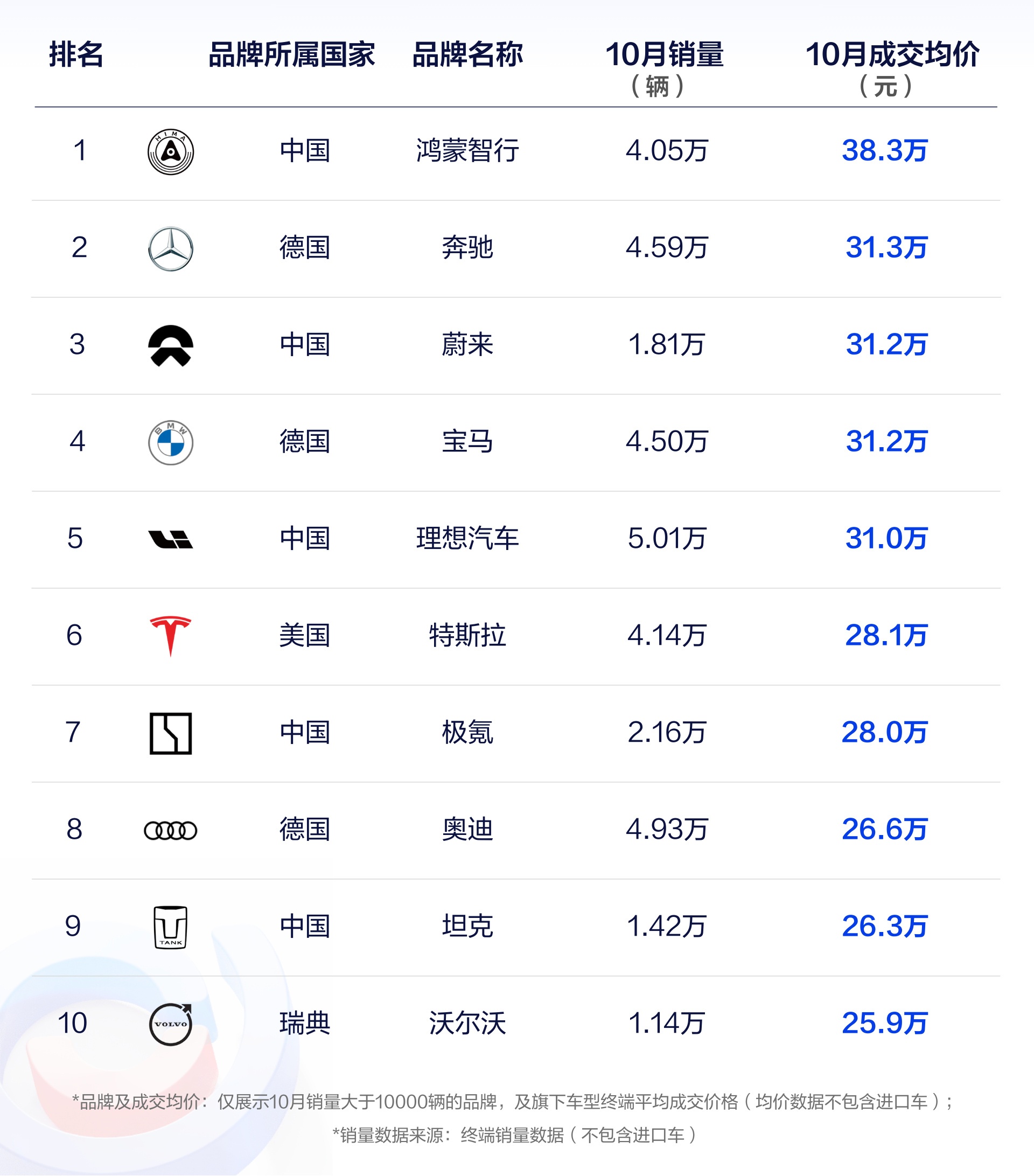 從具體的成交均價數(shù)據(jù)來看,除鴻蒙智行和奔馳外,蔚來與寶馬10月成交均價同為31.2萬元;理想汽車10月成交均價31萬元,位居第五;特斯拉以28.1萬元的終端成交均價排名第六;極氪成交均價28萬元,位列第七;奧迪、坦克和沃爾沃在10月份的終端成交均價分別為26.6萬元、26.3萬元、25.9萬元,依次排在第八至第十位。NZD驛資訊