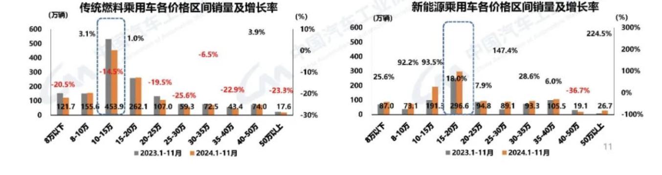 根據(jù)中汽協(xié)提供的數(shù)據(jù),按照價格區(qū)間劃分,今年1-11月,傳統(tǒng)燃料乘用車的銷量仍主要集中在10萬-15萬價格區(qū)間,累計銷量453.9萬輛,說明該價格段車型在市場端最受關(guān)注。Sta驛資訊