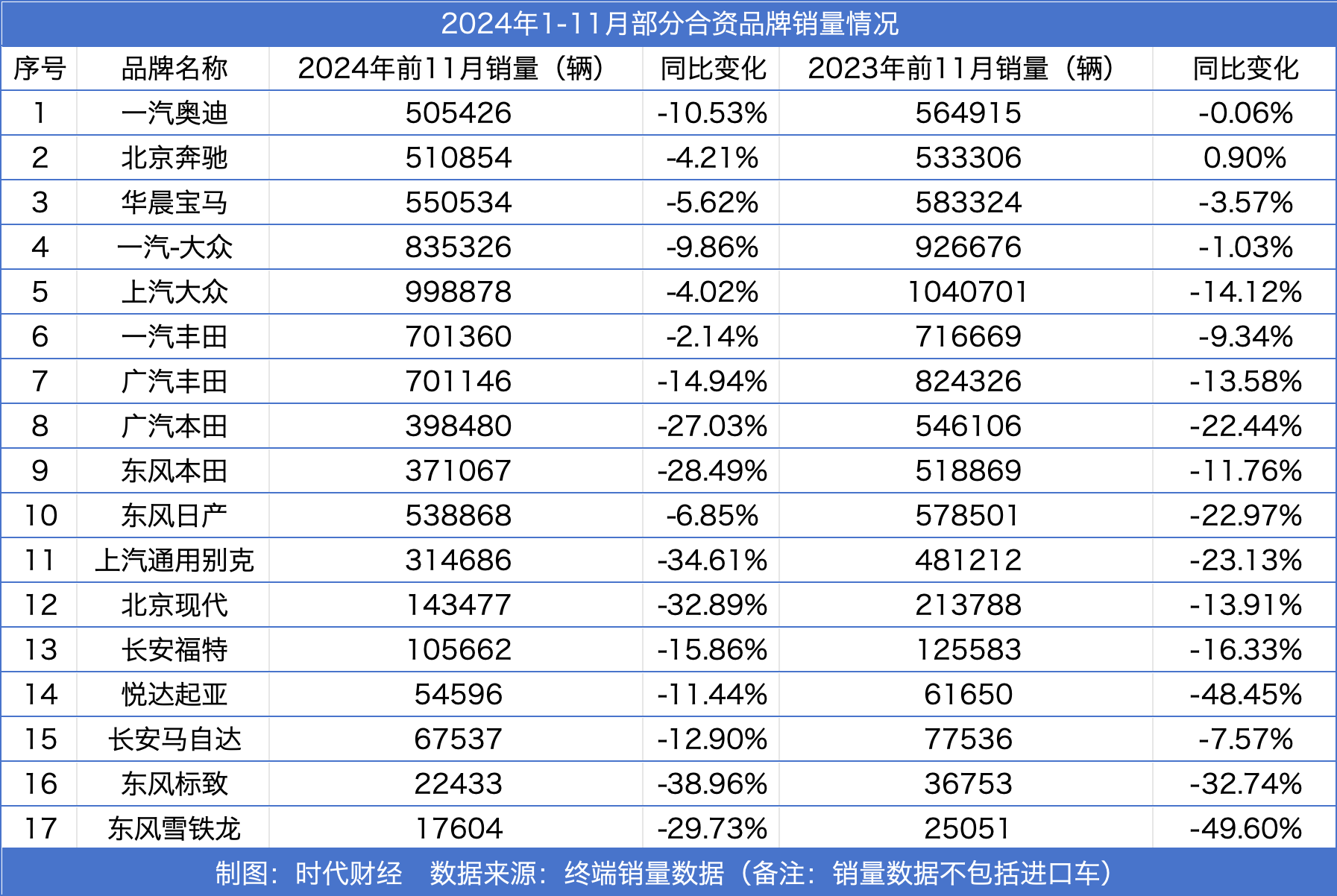 燃油車份額縮小,受此影響最大的是合資品牌。時代財經(jīng)統(tǒng)計了17家合資車企在2024年的銷量成績后發(fā)現(xiàn),截至11月底,17家合資車企的銷量均為負增長。Z63驛資訊