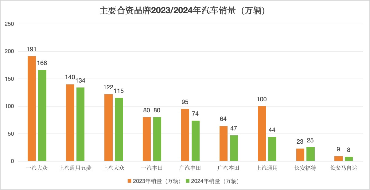 其余10家合資品牌中,一汽-大眾(含奧迪品牌及進(jìn)口車)、上汽大眾、廣汽豐田、廣汽本田、東風(fēng)日產(chǎn)、東風(fēng)本田、上汽通用等2024 年的銷量均有顯著下滑。其中,廣汽豐田、廣汽本田兩大日系合資品牌同比銷量降幅超過20%,美系合資品牌上汽通用的銷量降幅更超過50%。vpO驛資訊