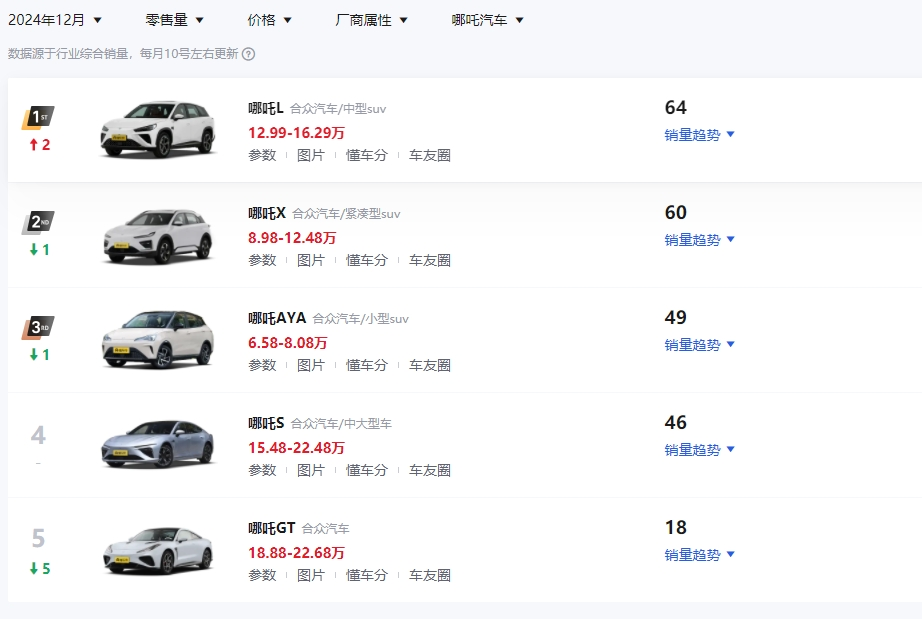 ▲哪吒汽車2024年12月多個(gè)車型單月銷量只有數(shù)十輛(來源:懂車帝) zQZ驛資訊