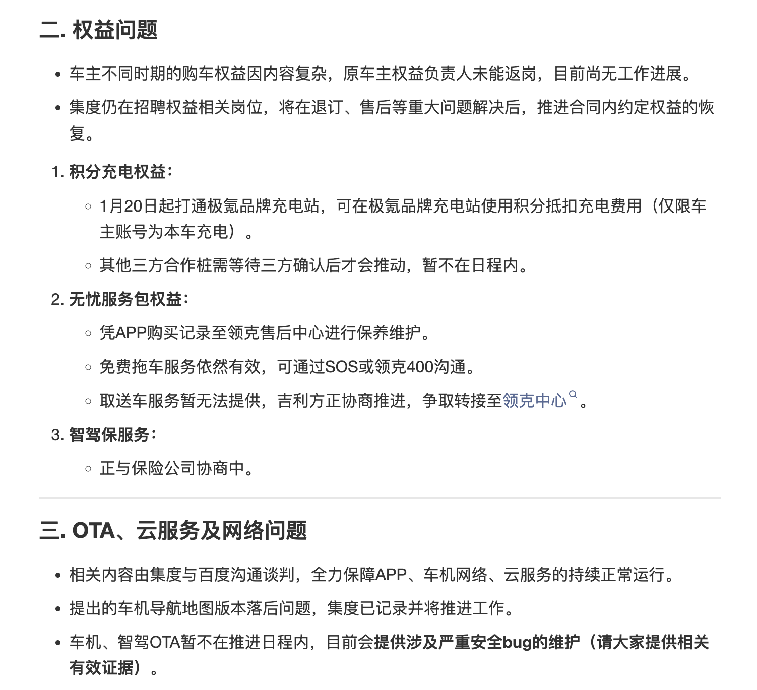 1月18日,極越車主在其創(chuàng)立的維權(quán)公眾號上更新了一篇題為《1月18日車主代表會談紀(jì)要》的文章,發(fā)布了車主代表就售后、權(quán)益、車機OTA及云服務(wù)等問題與企業(yè)溝通的最新進(jìn)展。8Ze驛資訊