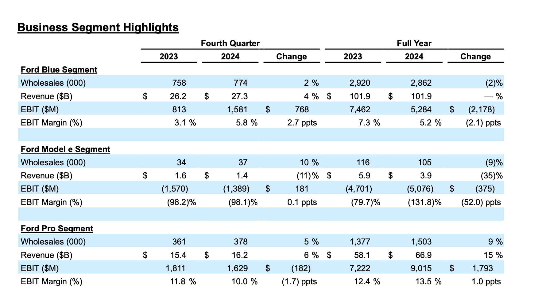 財(cái)報(bào)顯示,盡管2024年福特汽車全球批發(fā)銷量為447萬(wàn)臺(tái),營(yíng)收、凈利潤(rùn)分別達(dá)到1850億及59億美元,同比均有所提升;但鑒于行業(yè)定價(jià)壓力,在電動(dòng)車業(yè)務(wù)單元(Ford Model e),福特汽車全球批發(fā)銷量下滑9%,息稅前利潤(rùn)(EBIT)為負(fù),虧損額達(dá)到50.76億美元。HbM驛資訊