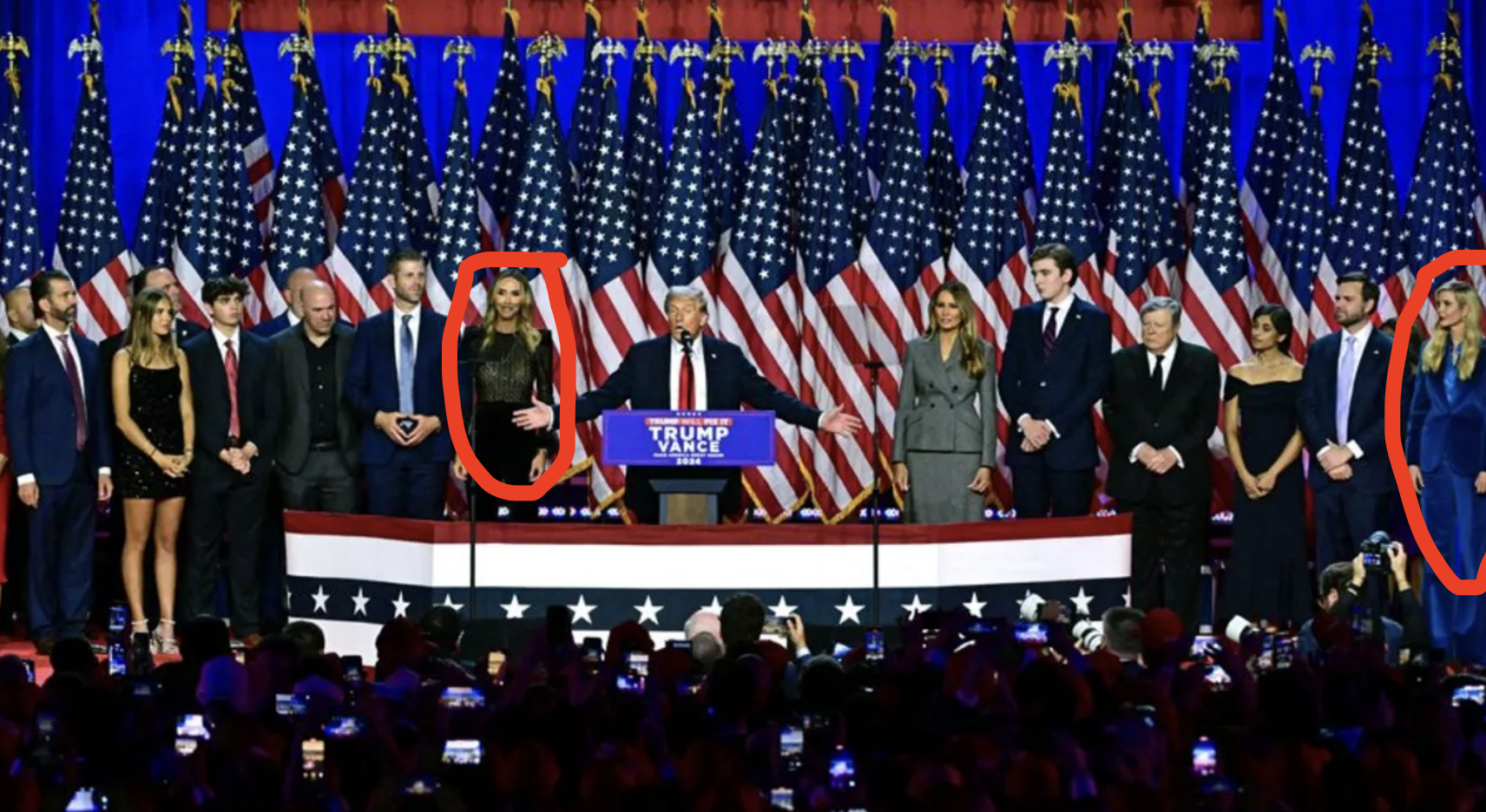 伊萬(wàn)卡站在右側(cè),而離特朗普最近的女性是二兒媳拉拉特朗普。(圖源:特朗普勝選演講視頻截圖) Pdu驛資訊