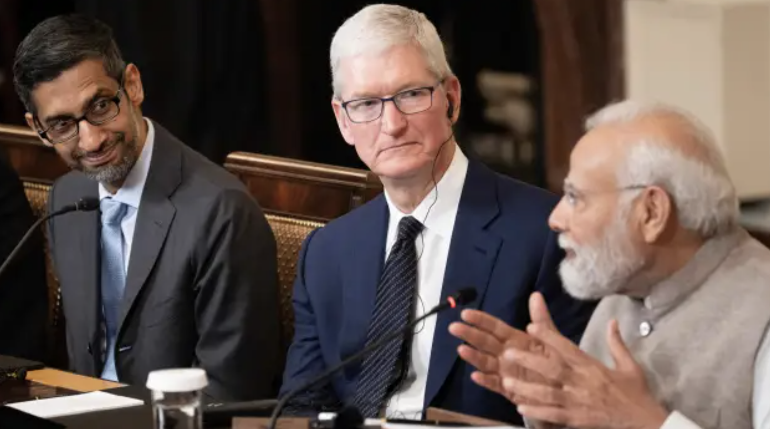 莫迪(右)與谷歌CEO桑達(dá)爾皮查伊(左)以及蘋(píng)果CEO庫(kù)克(中)交談。(圖源:社交媒體) z7a驛資訊
