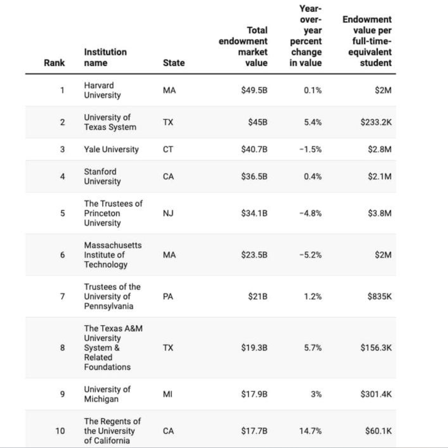 2023年排名前十的美國大學捐贈基金(圖源:美國全國大學商業(yè)官員協(xié)會) mKJ驛資訊